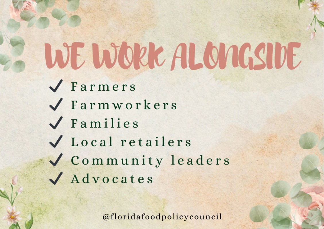 At the Florida Food Policy Council (FLFPC), we work to expand access to healthy, affordable food across every community in the state. Food shouldn’t be harder to get because of where you live, how much you earn, or who you are.
